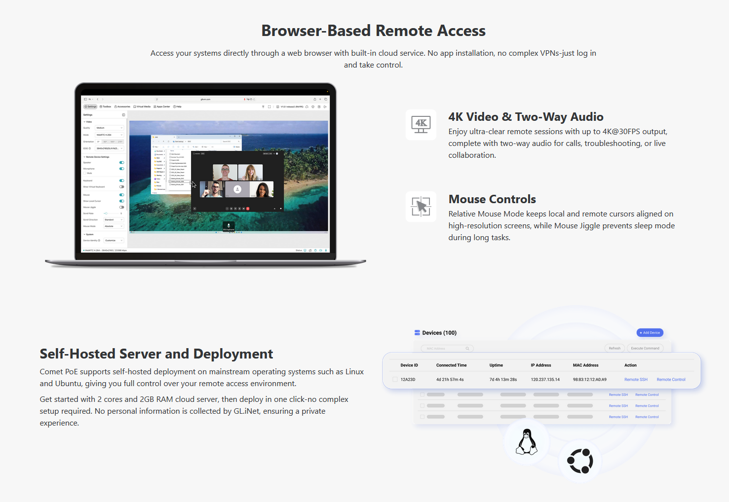 - Browser-Based Access - Remote control from Windows, macOS or Linux, no app required