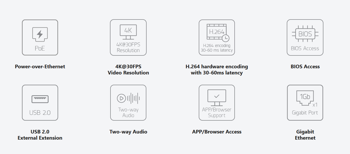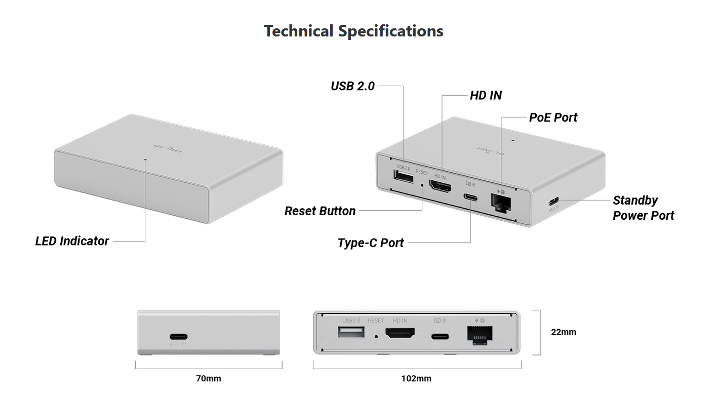 | Interface | 1 x Ethernet port (802.3af/at PoE support) 1 x USB 2.0 Type-A port (for external extension) 1 x USB 2.0 Type-C port (use as USB device) 1 x HD IN port 1 x Reset button |