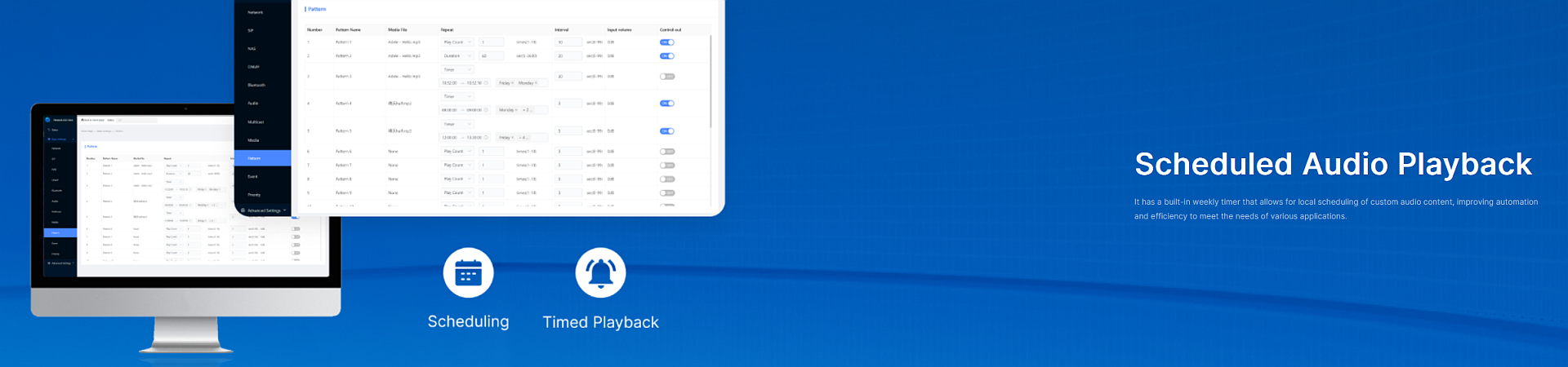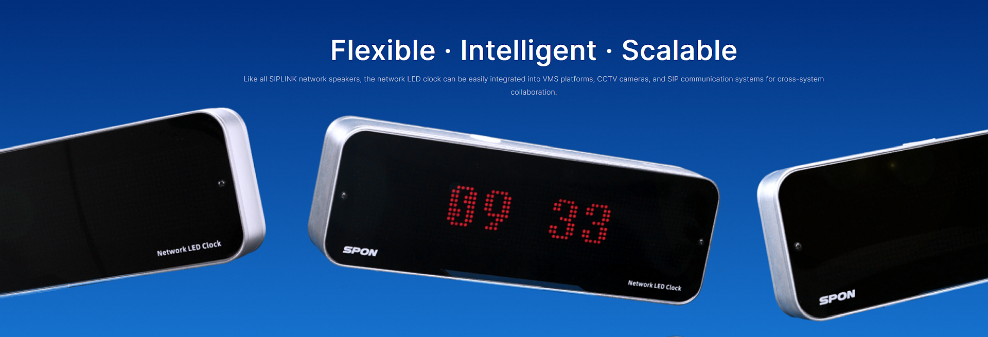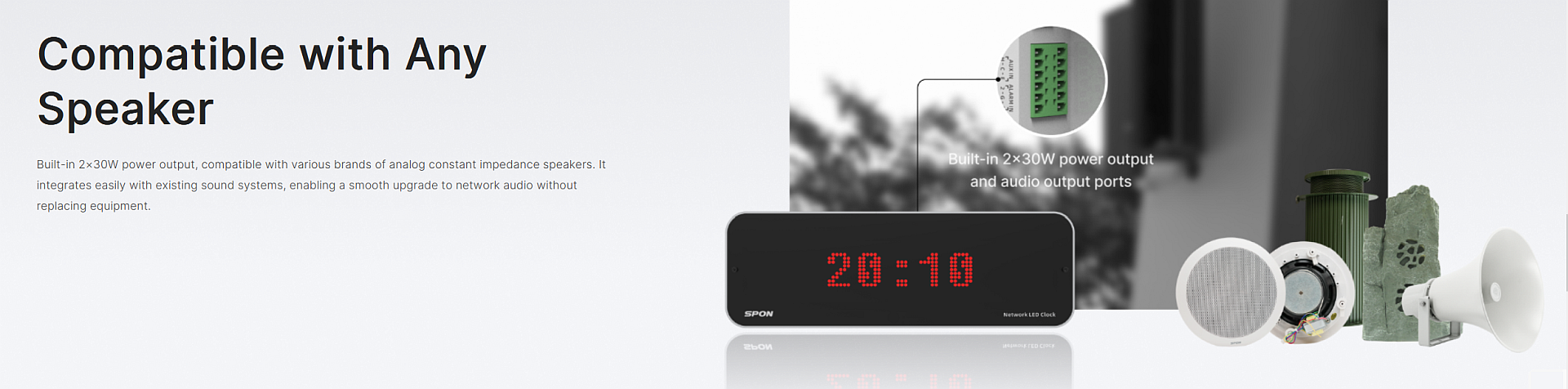 Die Netzwerk-LED-Uhr ist ein Audioterminal mit eingebauter LED-Uhrenanzeige, die eine präzise NTP-Zeitsynchronisation gewährleistet. Sie verfügt über einen eingebauten 2×30W-Verstärker zur Ansteuerung von 8Ohm Lautsprechern und ein integriertes Mikrofon für die Gegensprechanlage, was die Kommunikation in Klassenzimmern und Überwachungsräumen verbessert. Darüber hinaus macht es jeden passiven Lautsprecher zu einem netzwerkfähigen Gerät, das die Vorteile von SIPLINK-Netzwerk-Audio voll ausschöpft - unabhängig von Marke oder Design.